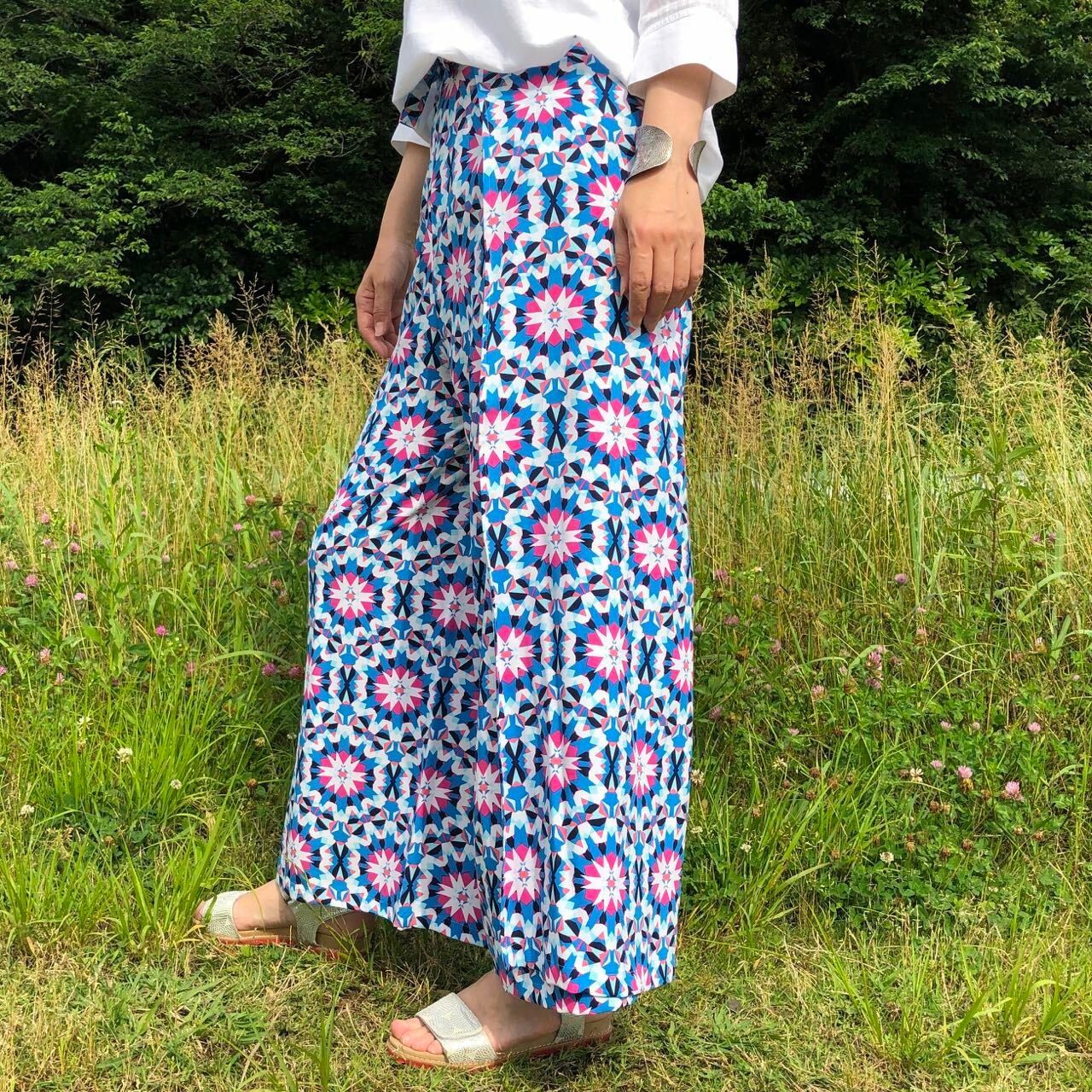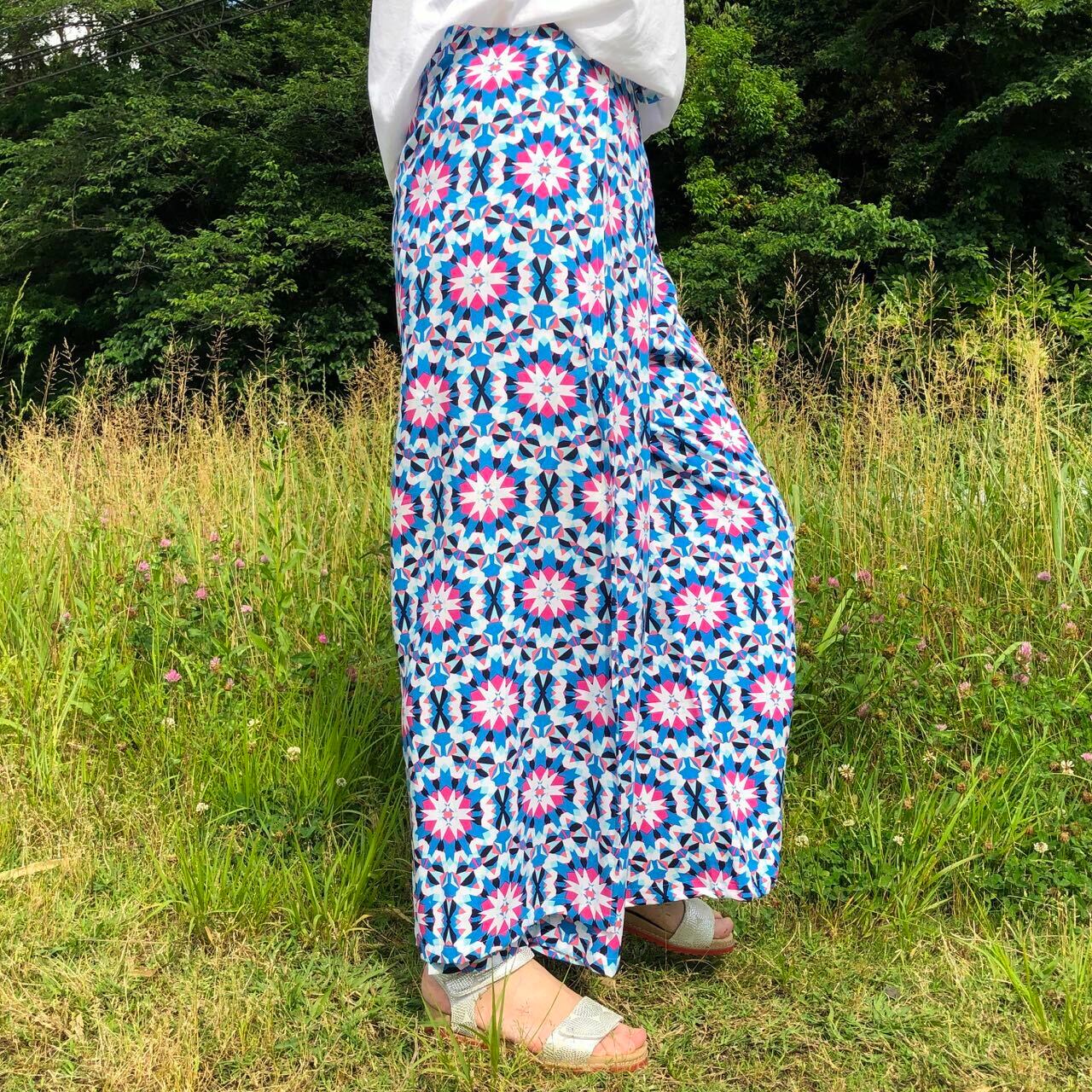 紋の巻パンツはインドから上質なビスコースをこの一枚のために仕入れ、たっぷり布地を使って日本で一枚一枚その布の質に合わせて丁寧に縫いあげた一点ものです。