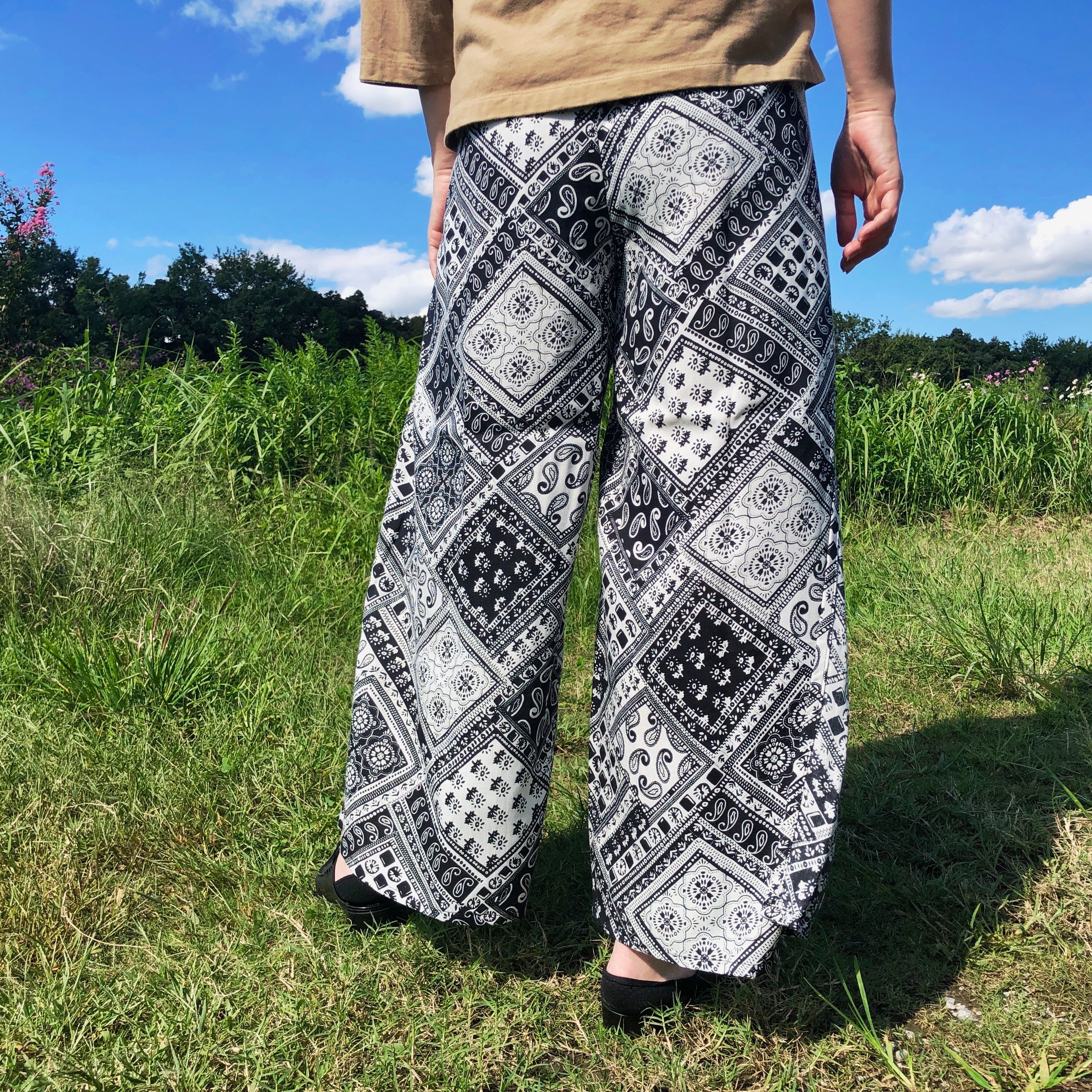 紋の巻パンツはインドから上質なビスコースを、この一枚のために仕入れ、たっぷり布地を使って日本で一枚一枚その布の質に合わせて丁寧に縫いあげた一点ものです。