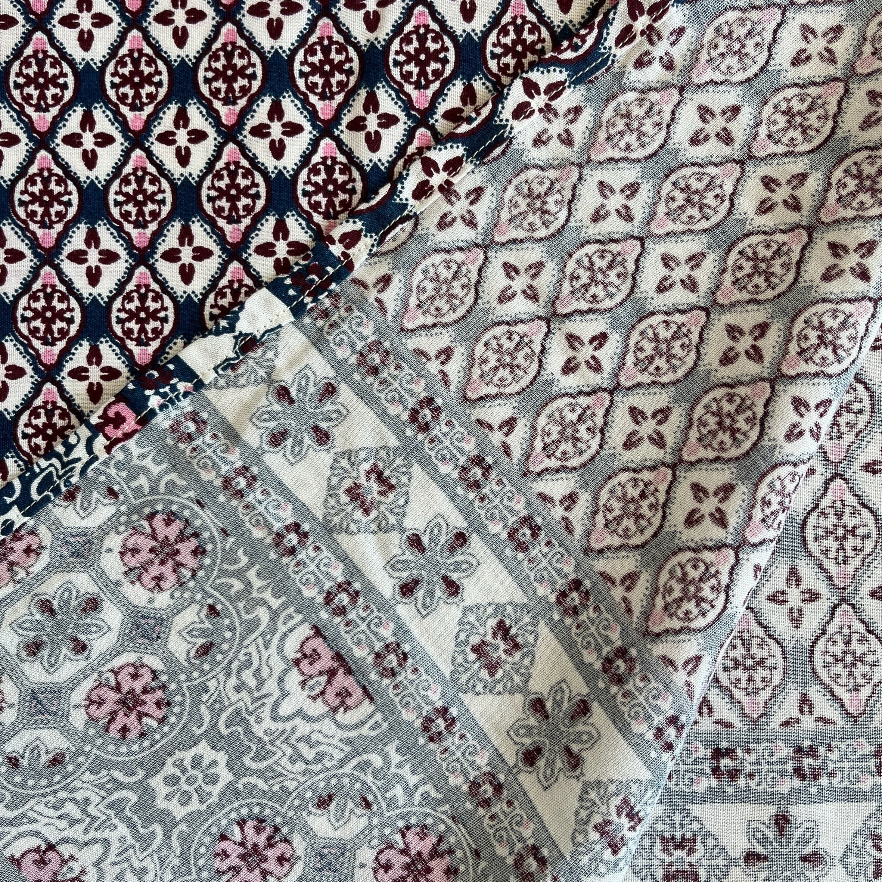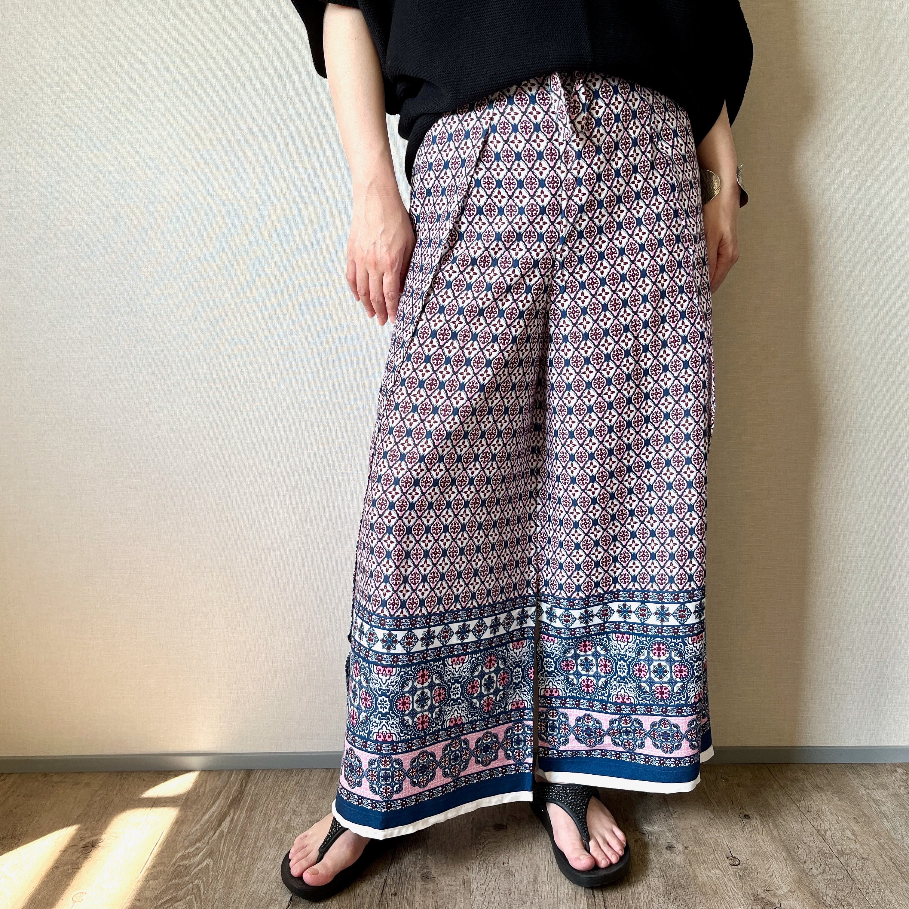 紋の巻パンツはインドから上質なビスコースを、この一枚のために仕入れ、たっぷり布地を使って日本で一枚一枚その布の質に合わせて丁寧に縫いあげた一点ものです。